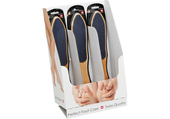 Der Thekendisplay «Natural Line» gefüllt mit 30 Feilen, assortiert. Die beliebte Hornhautfeile wird neu in verschiedenen Holzvarianten zum grossen Teil in Handarbeit gefertigt. Das Holz aus kultivierten Wäldern, ist sehr stabil und formbeständig, wird mit einem Lack auf Wasserbasis lackiert und bietet einen optimalen Schutz vor Wasser und alkoholischen Substanzen. Die Feile nicht im Wasser oder in einer alkoholischen Lösung einlegen, nur kurz eintauchen. Die unterschiedlichen Schleiffolien, 60 und 100 Korn sind antimikrobiell, Sanitized behandelt. Dies schützt dauerhaft vor Mikrobenbefall. Die Entstehung unangenehmer Gerüche und die Zerstörung des Materials werden dauerhaft verhindert.