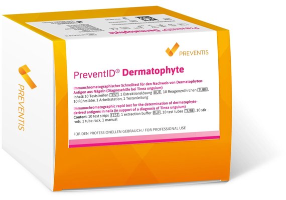 PreventID Nagelpilztest Dermatophyte ist ein immunologischer Schnelltest für den qualitativen Nachweis von Dermatophyten-Antigen in Probenmaterial von Zehen- oder Fingernägeln und dient als Hilfe zur Diagnose von Infektionen mit Nagelpilz.
